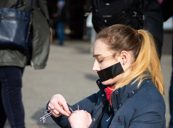 Each performer wore black tape over their mouth to symbolise voicelessness of those disadvantaged women who are unable to speak up for themselves and have their voices heard.